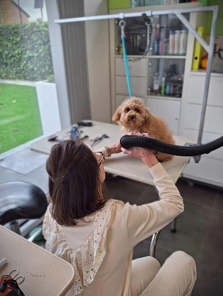 Sommige honden vinden de droger-waterblazer leuk, anderen zijn een beetje bang. Ik gebruik regelmatig een ‘hoodie’ in badstof om vocht op te nemen en het geluid te temperen. Als uw lieverd panikeert bij het drogen van bijv. de oortjes, dan maken we die handdoekdroog en wordt er geoefend tijdens de volgende trimbeurten tot er gewenning ontstaat, of ik gebruik de föhn. De bedoeling van de waterblazer is ook om losse haren en overtollige wintervacht te verwijderen.