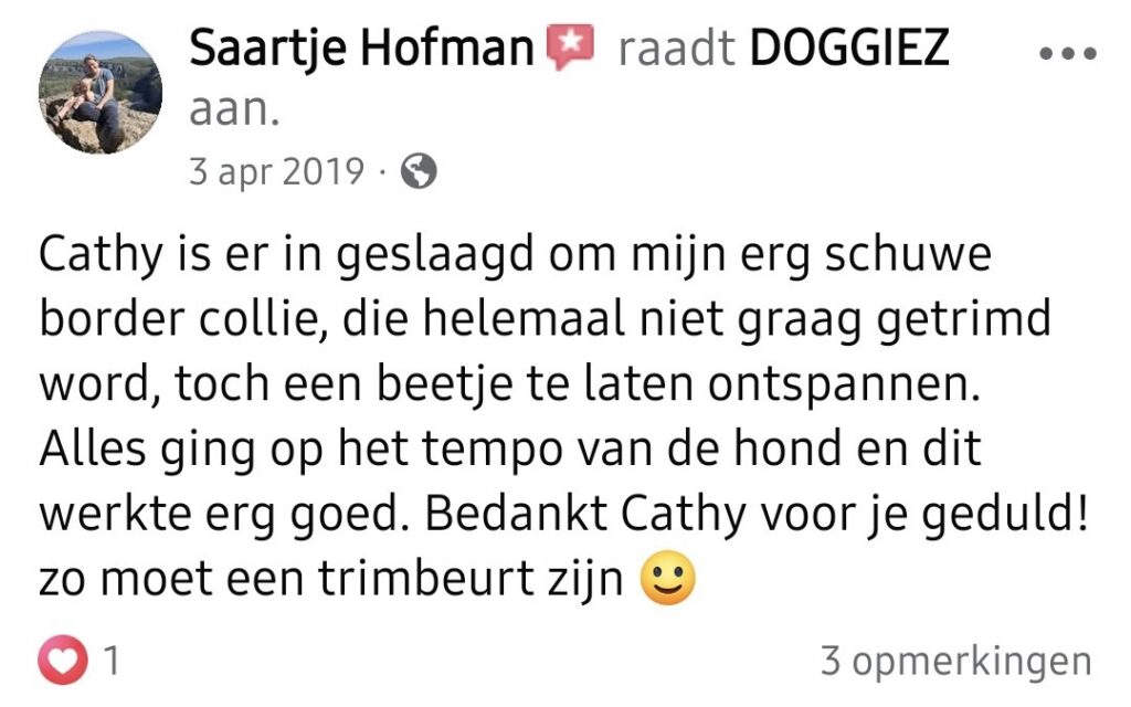 Een trimbeurt bij Doggiez is gebaseerd op de samenwerking tussen trimmer en hond. De band opbouwen gaat veel vlotter als de eigenaar niet aanwezig is. Het is bijgevolg niet toegelaten bij je hond te blijven tenzij ik merk dat de hond nood heeft aan de extra ondersteuning van de eigenaar en het de trimbeurt niet bemoeilijkt.